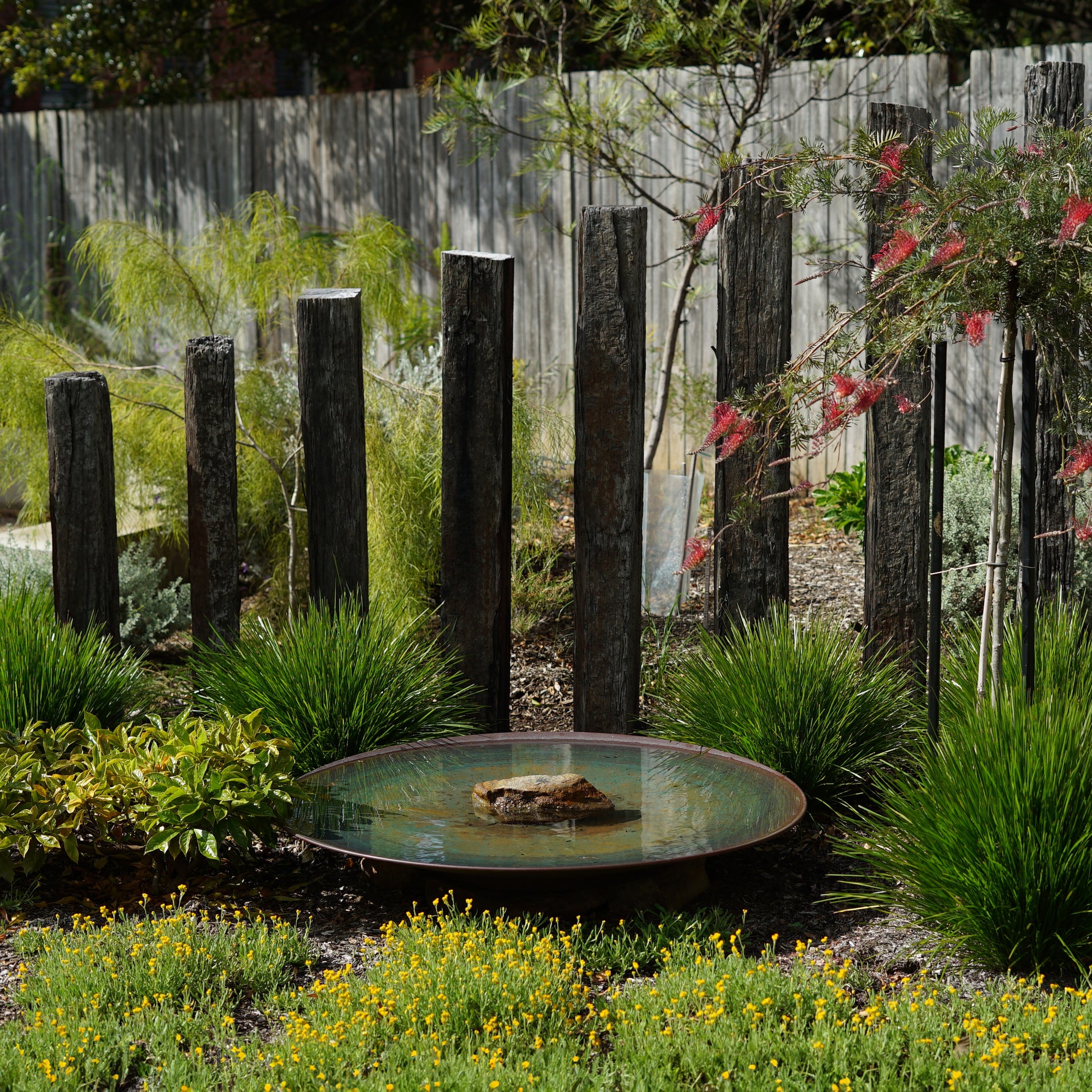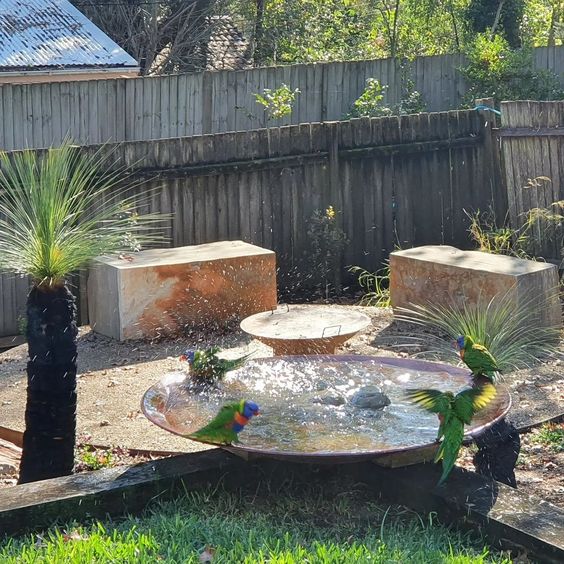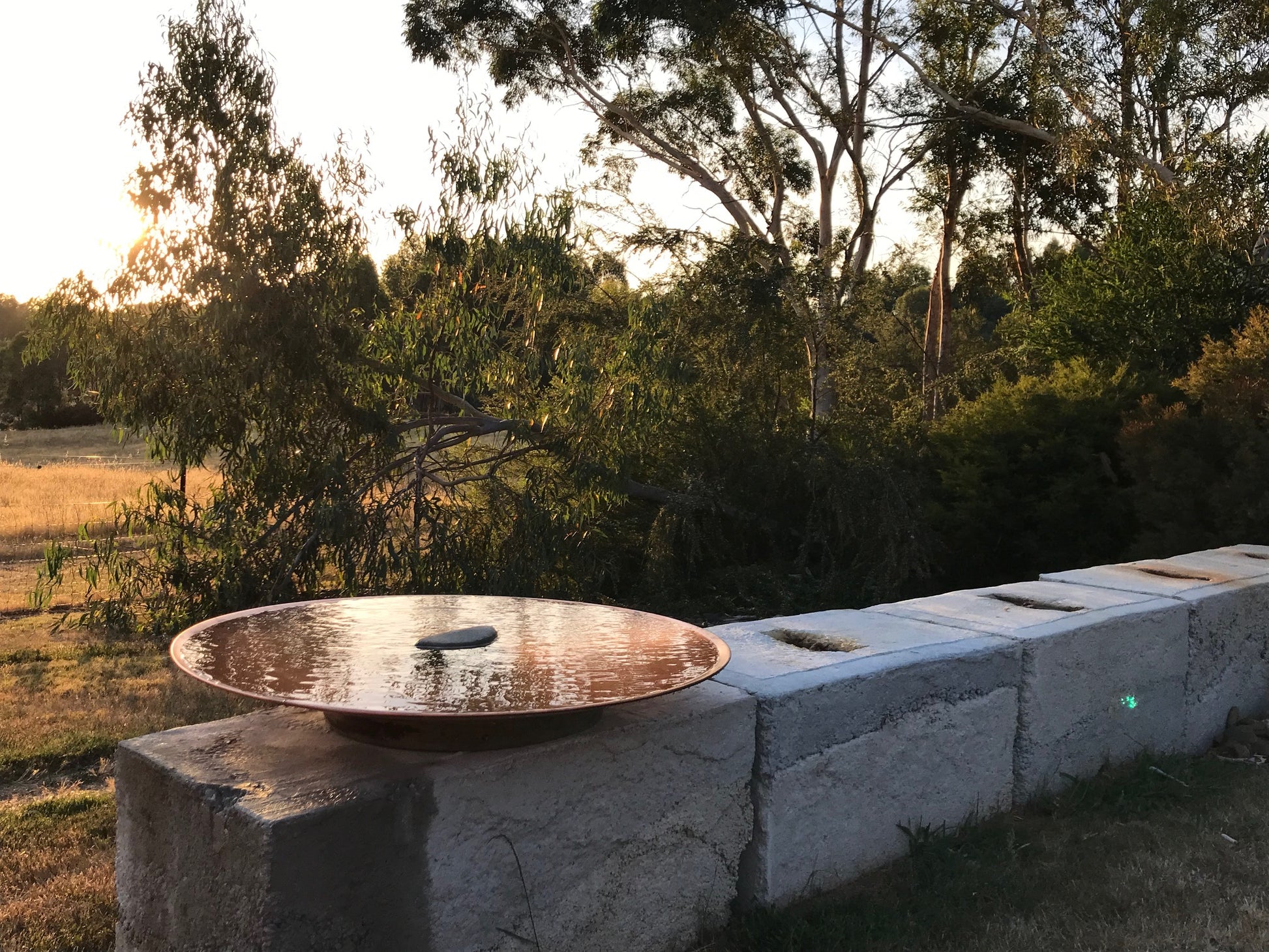 The Extra-Large Spun Copper Dish is designed to be used on the ground as a reflection pool. Of course, it also serves bird life. It is 1.1m wide, 12cm deep and holds 50L of water.