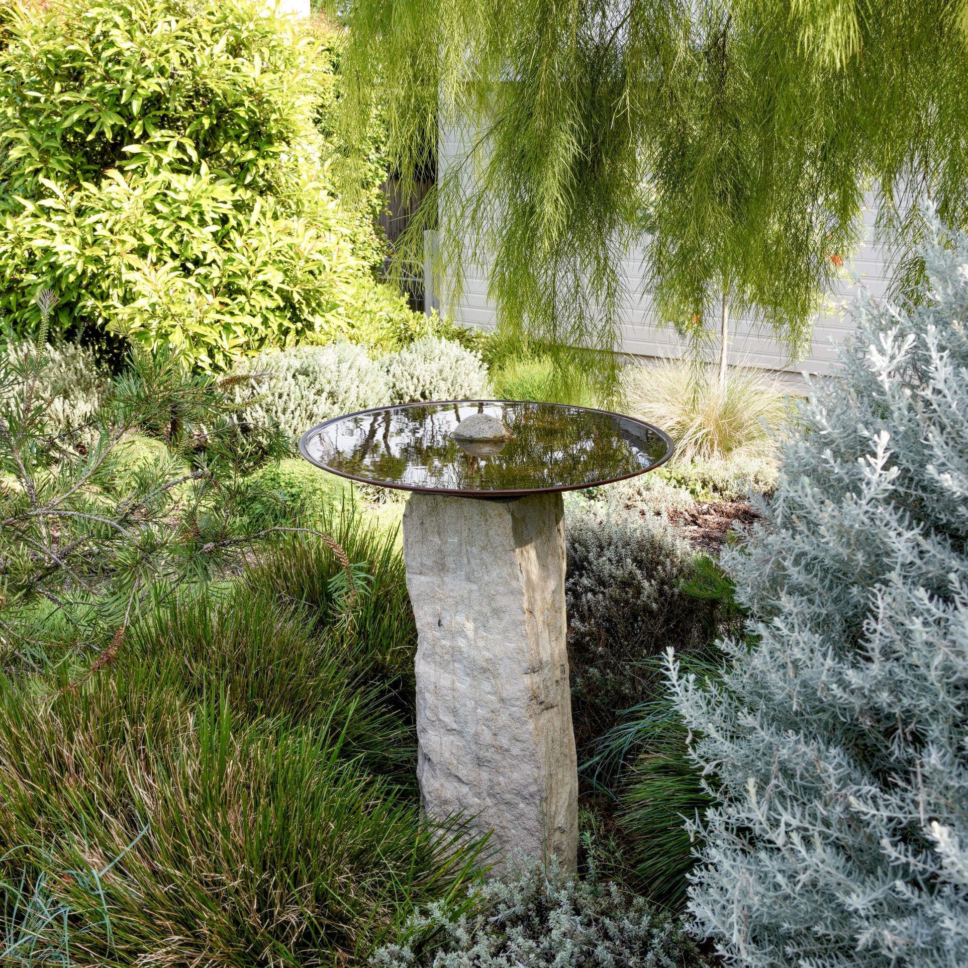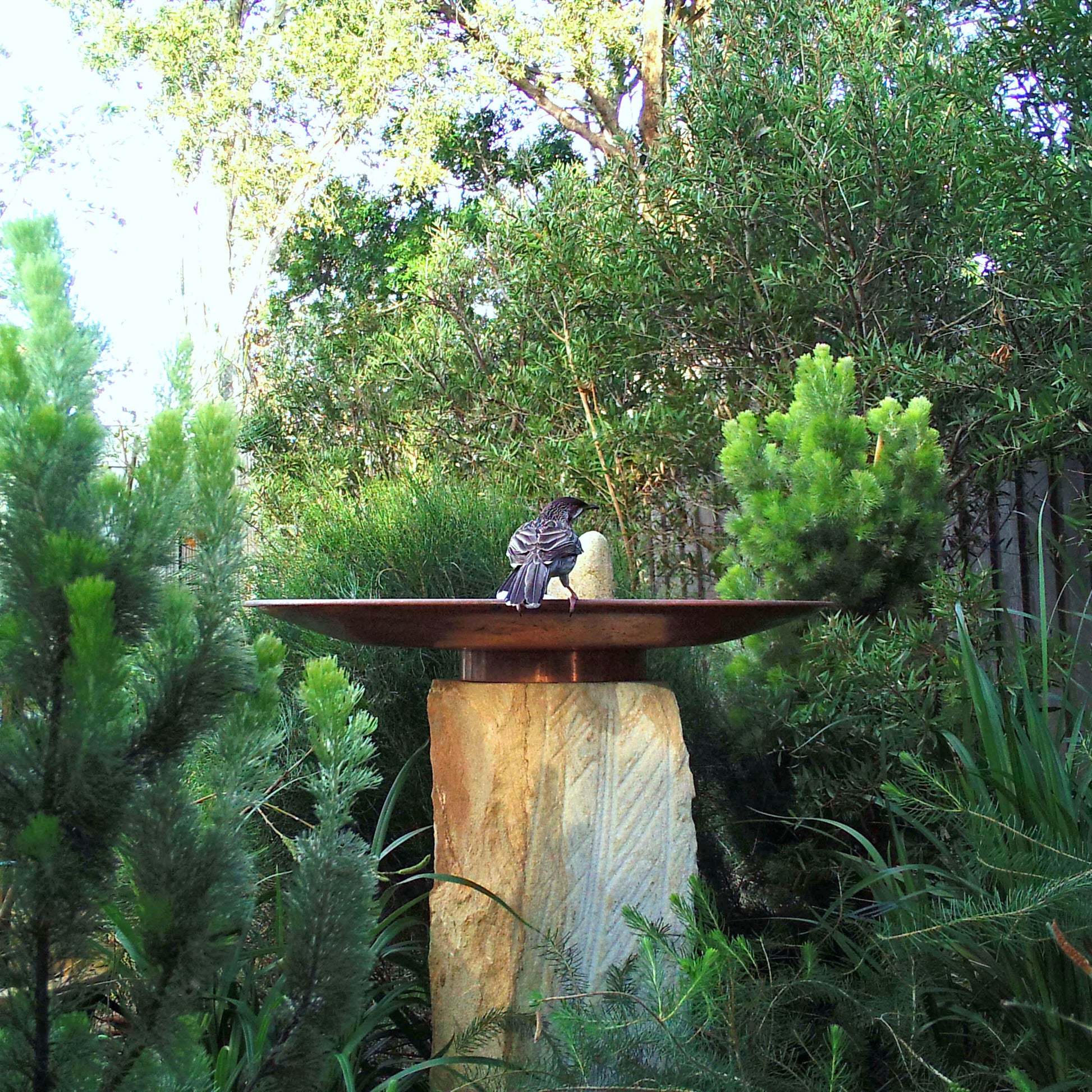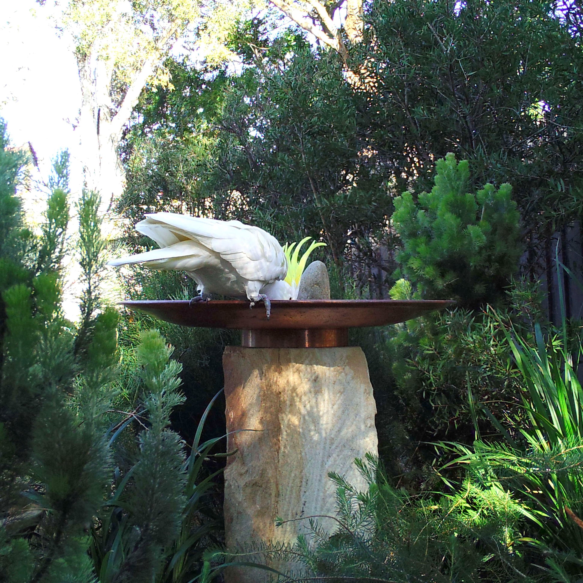 The Sandstone Plinth Bird Bath is a 78cm wide and 5cm deep dish raised on a sandstone plinth. The solid sandstone, 70-90cm high, is in perfect visual balance with the spun copper dish. The sandstone is un-sealed and will weather over time, thus beautifully complementing the ageing patina of the copper dish. The dish sits on a copper ring to provide an even base, all parts are un-attached so it is easy to tip and clean or move.