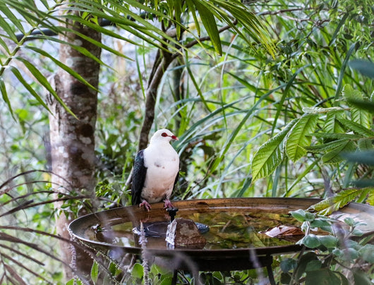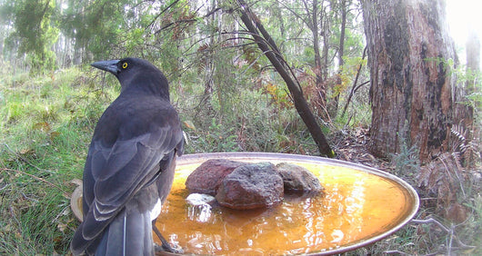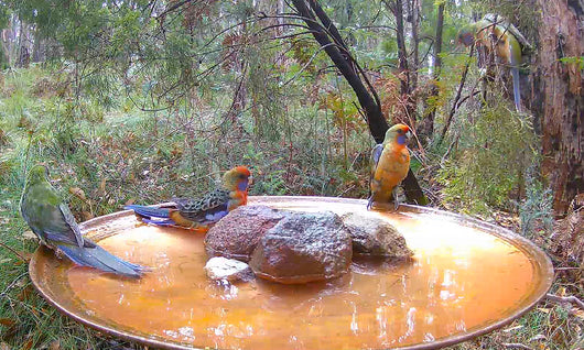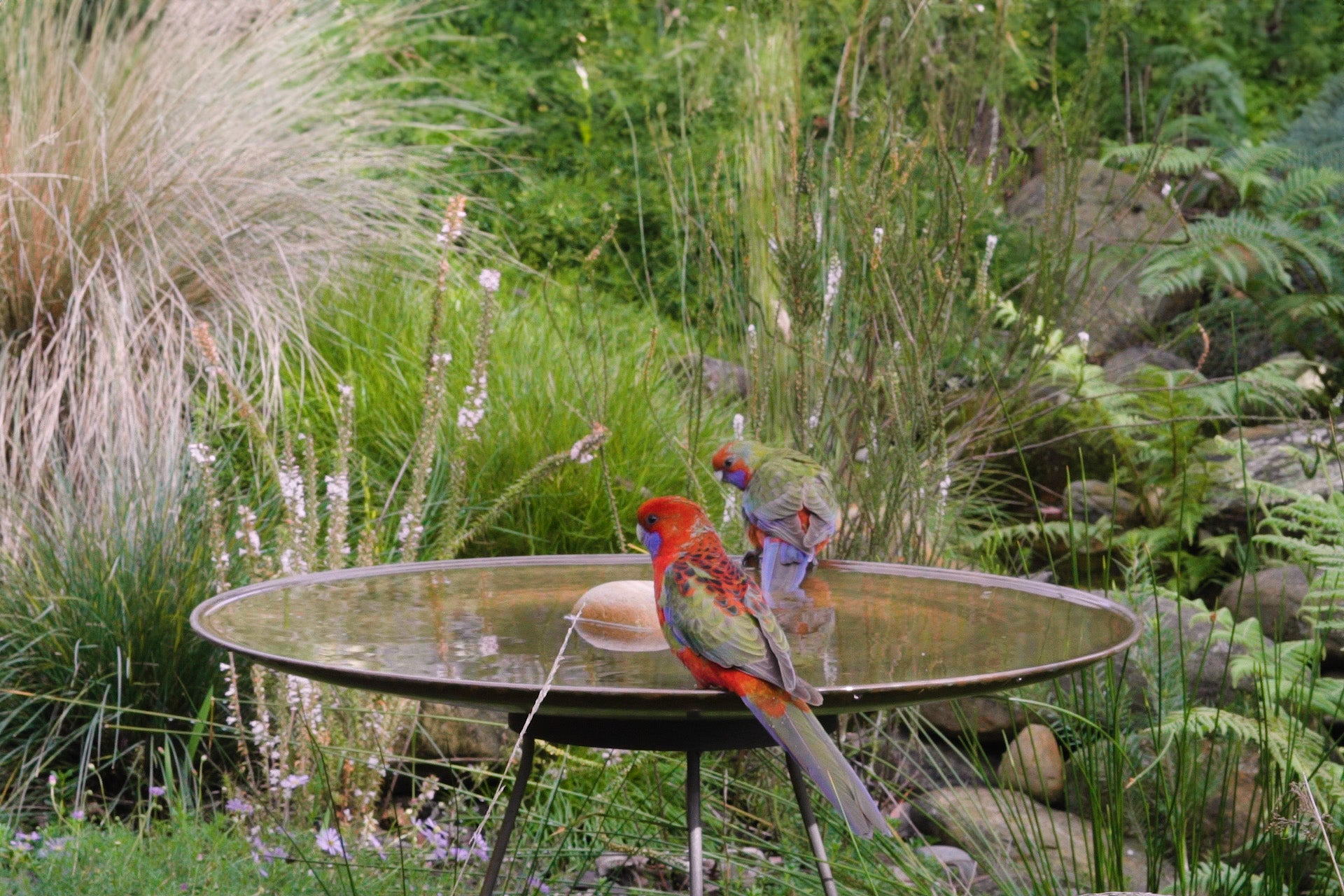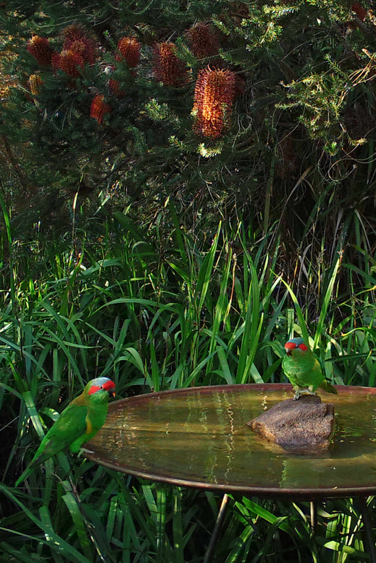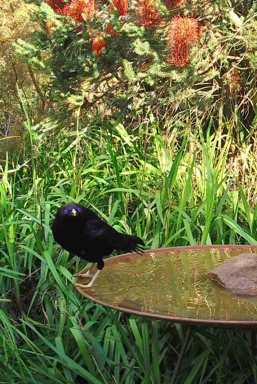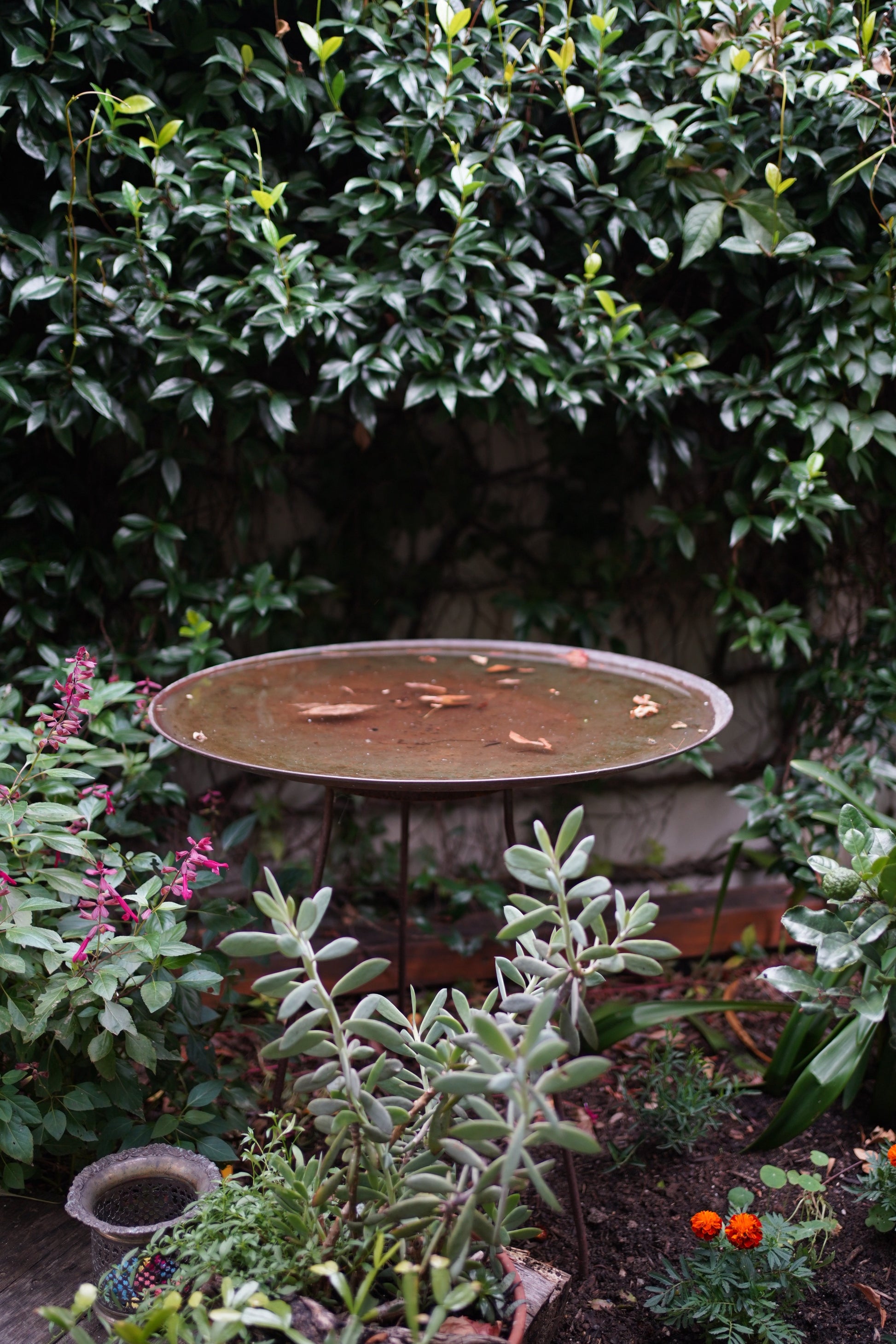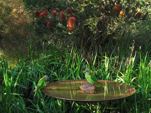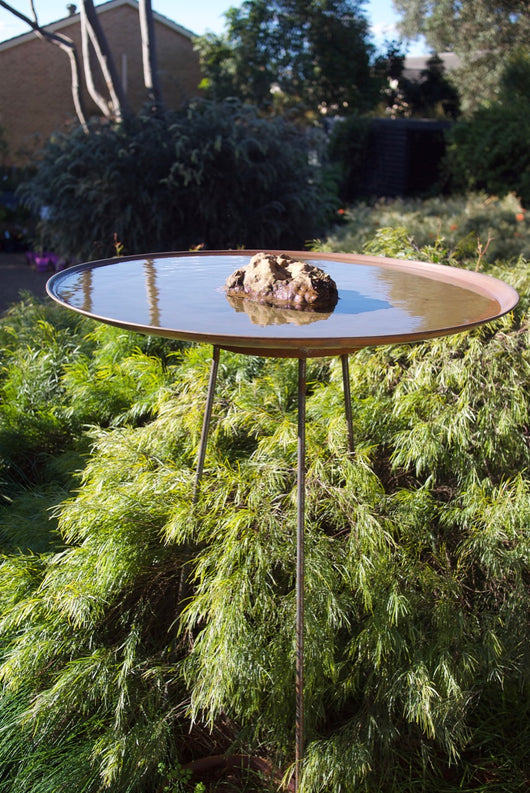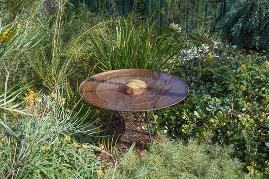 The Floating Steel Stand Bird Bath is a large dish (78cm x 5cm deep) raised on a steel stand that is designed to disappear amongst the plants in a garden bed.