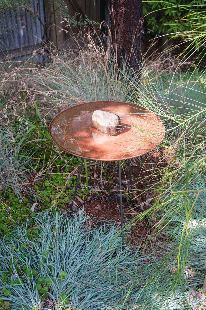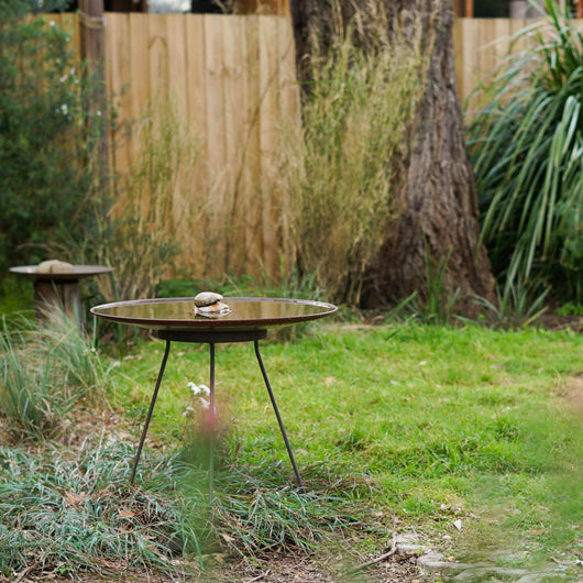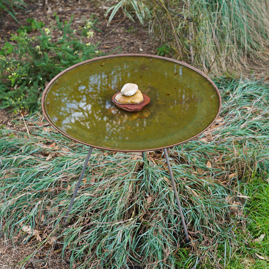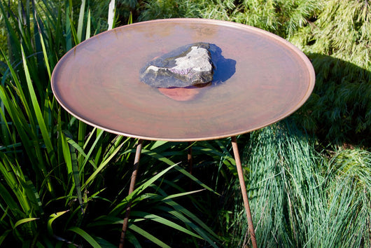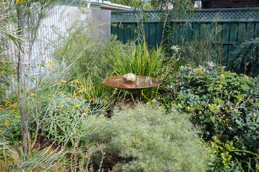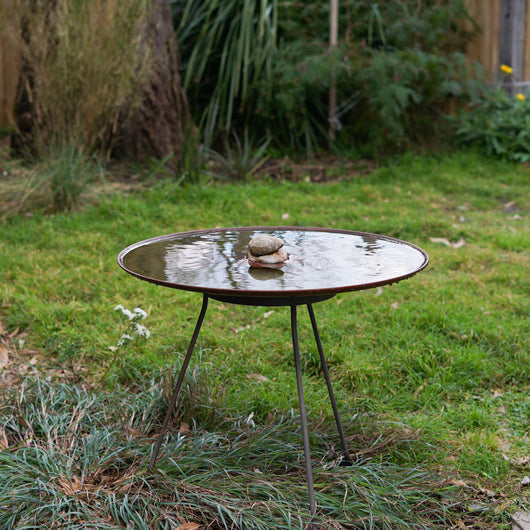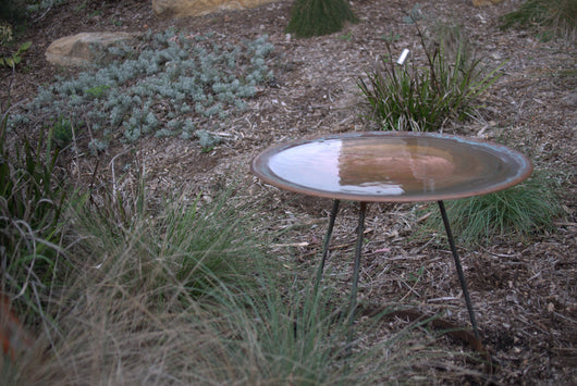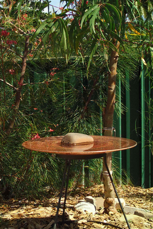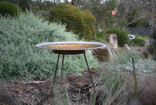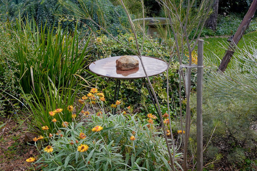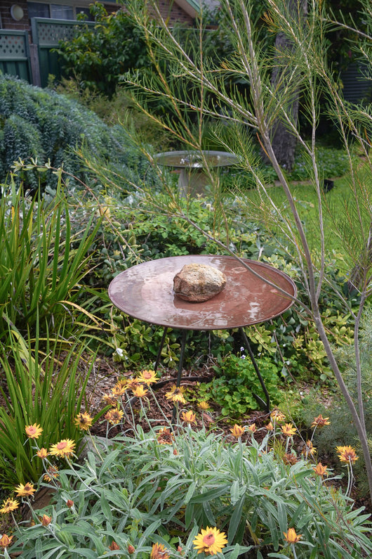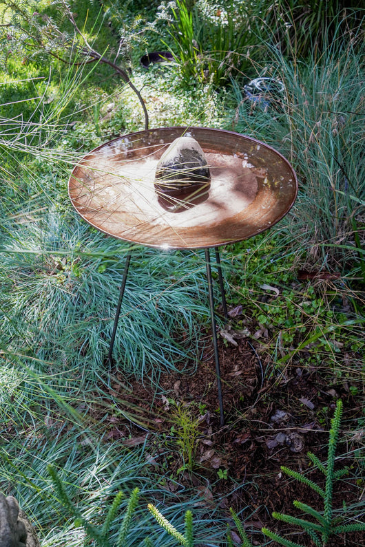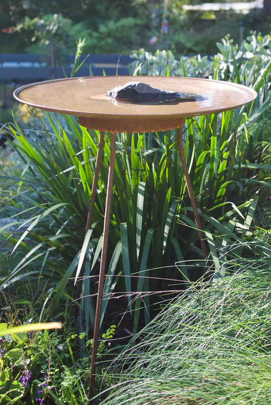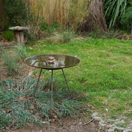 The Medium Dish on Floating Steel Stand bird bath is a medium dish (60cm diameter) raised on a steel stand that is designed to disappear amongst the plants in a garden bed.